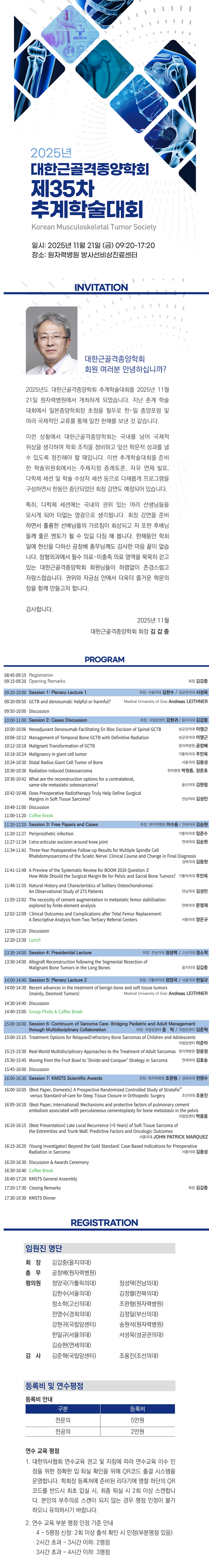 2025년 대한근골격종양학회 제 35차 추계학술대회 장소: 원자력병원 방사선비상진료센터 1층 상당 일시: 2025년 11월 21일(금) : 9: 20~ 17: 20